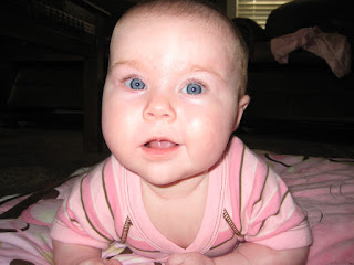 1. As of this week, she's started to eat baby food. She's only eaten peas so far but she really likes them. Next week we might try carrots! I love carrots, Kevin hates them so we'll see whose taste buds she's got!